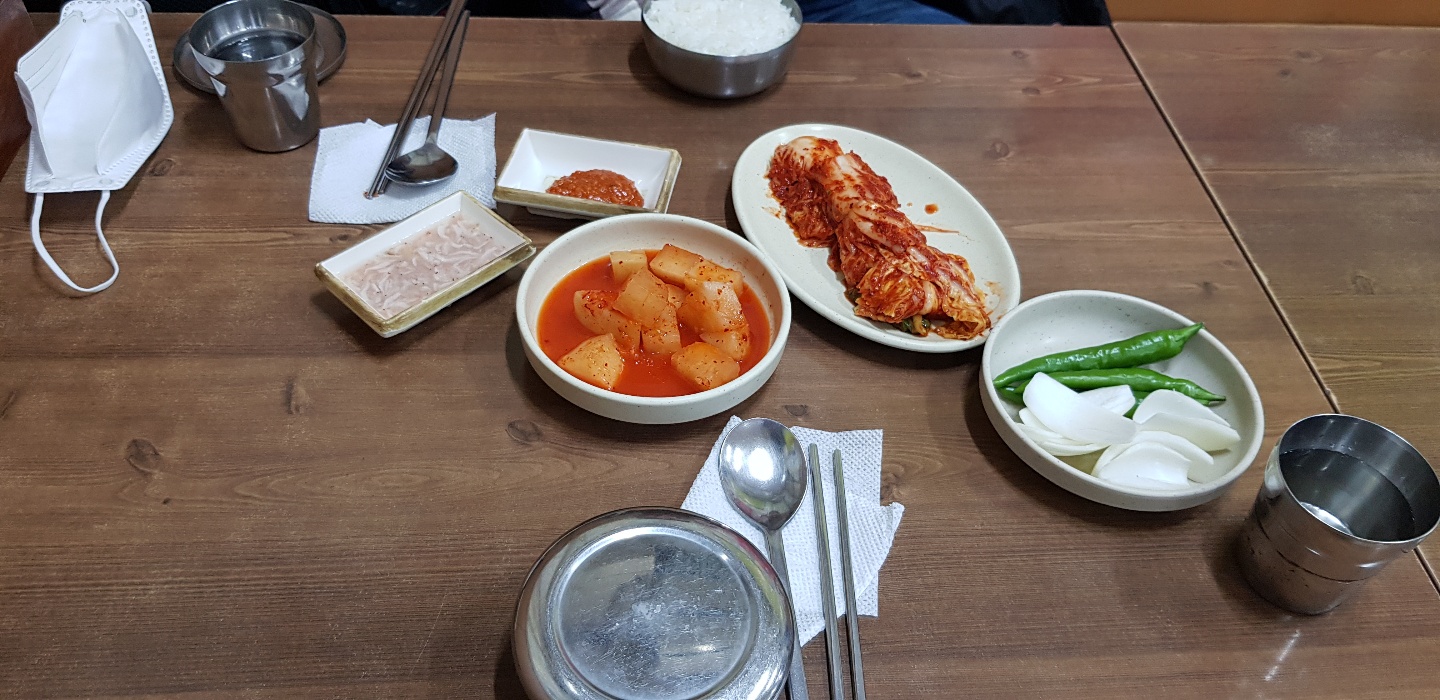 밑반찬으로는 깍두기와 겉절이, 고추, 양파가 나왔습니다.