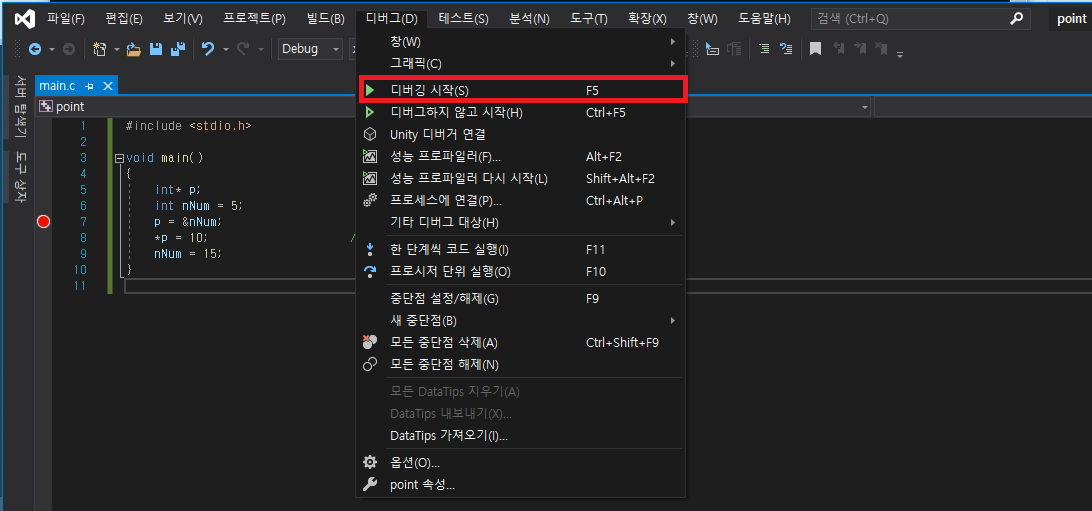 1. F5키 또는 메뉴 - 디버그 - 디버깅 시작을 누릅니다.