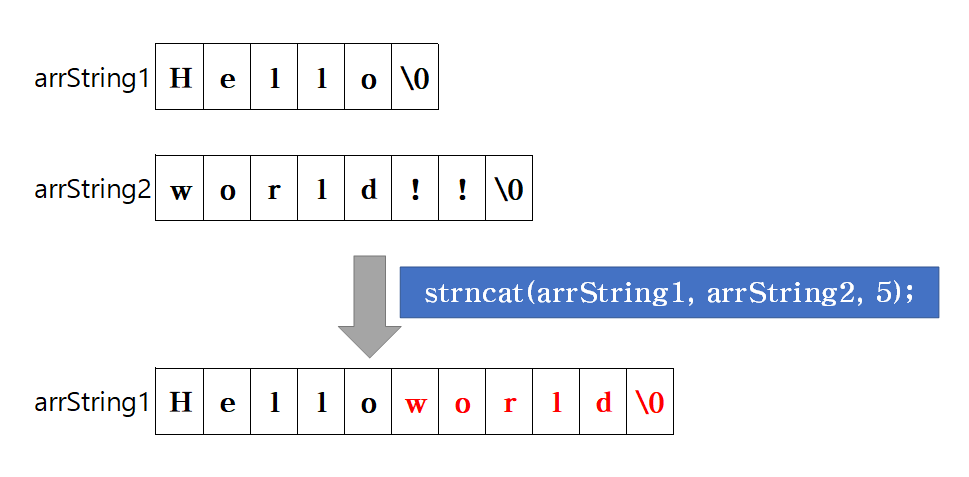 arrString1의 \0(NULL)값 위치에 arrString2의 문자를 5개(world)까지 붙여 넣습니다.