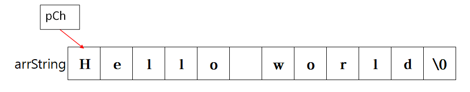 8번째 줄(char* pCh = arrString;)에서 arrString의 시작 주소를 포인터인 pCh로 저장합니다.