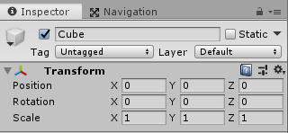 2. Cube 오브젝트(움직일 오브젝트) 생성 및 위치는 0, 0, 0으로 설정하고 Material을 추가하여 큐브색을 변경합니다.