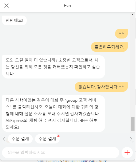 그러던 채팅 봇을 통해 문의 내용을 입력해서 알리익스프레스 고객센터와 연락이 되었습니다.