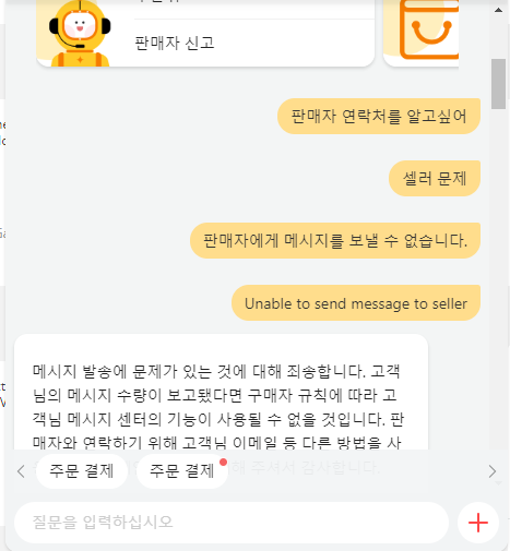 판매자에게 메시지를 보낼 수 없다고 적었더니,