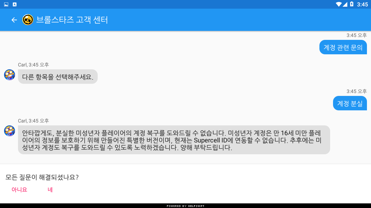 "안타깝게도, 분실한 미성년자 플레이어의 계정 복구를 도와드릴 수 없습니다. 미성년자 계정은 만 16세 미만 플레이어의 정보를 보호하기 위해 만들어진 특별한 버전이며, 현재는 Supercell ID에 연동할 수 없습니다. 추후에는 미성년자 계정도 복구해드릴 수 있도록 노력하겠습니다. 양해 부탁드립니다."
