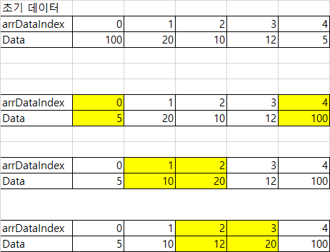 그 후 arrData[0]과 arrData[nIndex(=4)]를 스왑 합니다.(5, 20, 10, 12, 100)