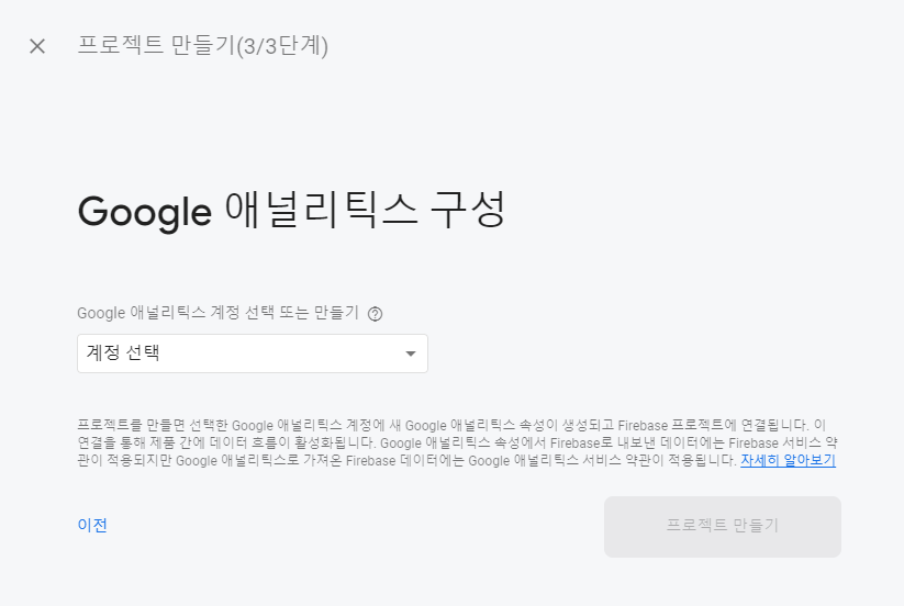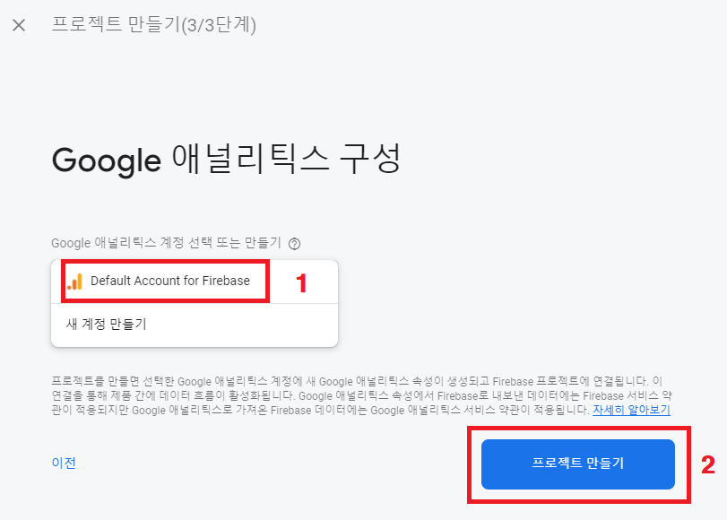 계정이 따로 없다면, Default Account for Firebase로 설정한 후 "프로젝트 만들기" 버튼을 클릭합니다.