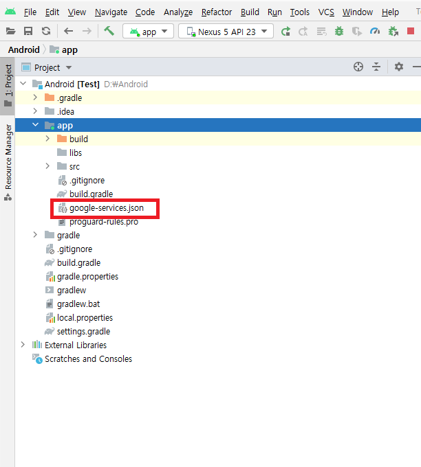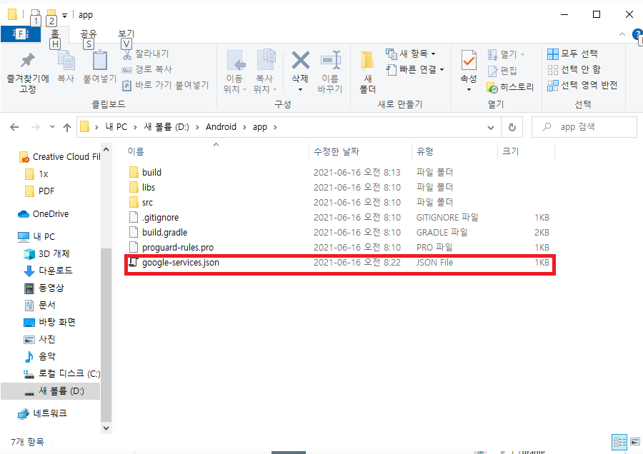 설명과 같이 다운로드 받은 google-services.json을 프로젝트의 app에 넣어줍니다.