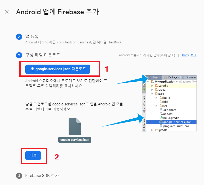 "google-services.json 다운로드" 버튼을 누릅니다.