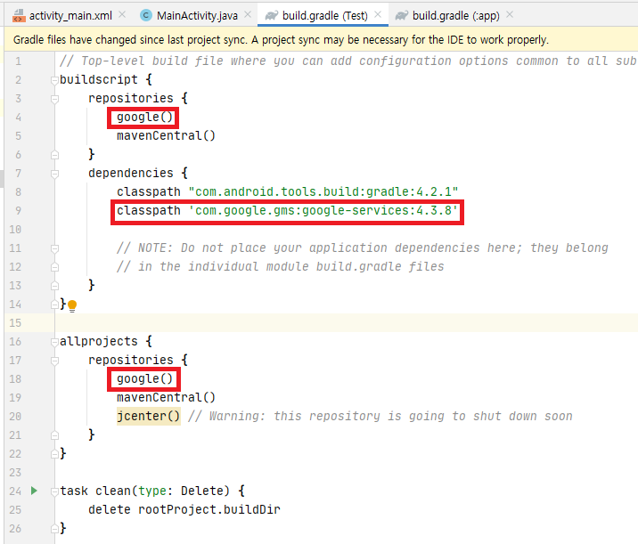 앱수준의 build.gradle, 프로젝트 수준의 build.gradle을 수정해야합니다.