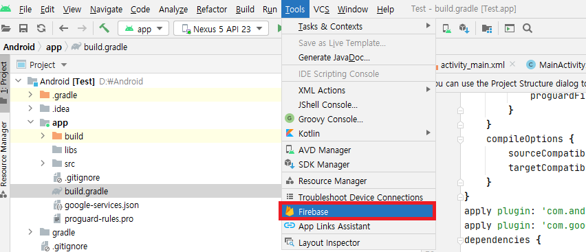 안드로이드 스튜디오 메뉴에서 Tool-Firebase를 클릭합니다.