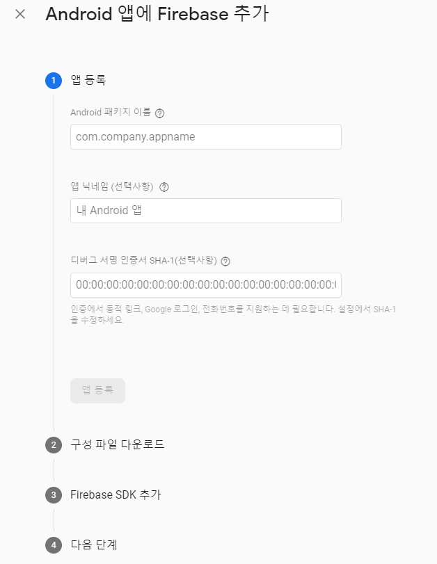 Android 패키지 이름, 앱 닉네임(선택), 디버그 서명 인증서 SHA-1(선택)을 입력해야합니다.