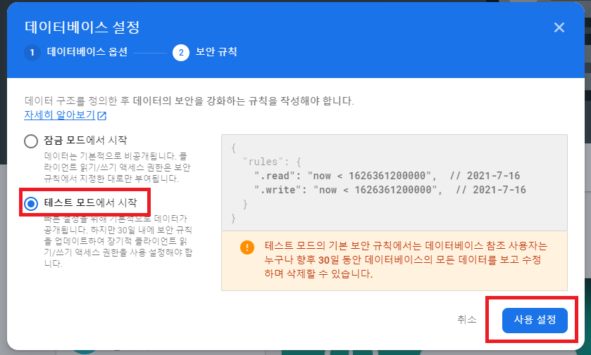 테스트를 하기위해서 테스트 모드에서 시작으로 변경해주고 사용설정을 클릭해줍니다.