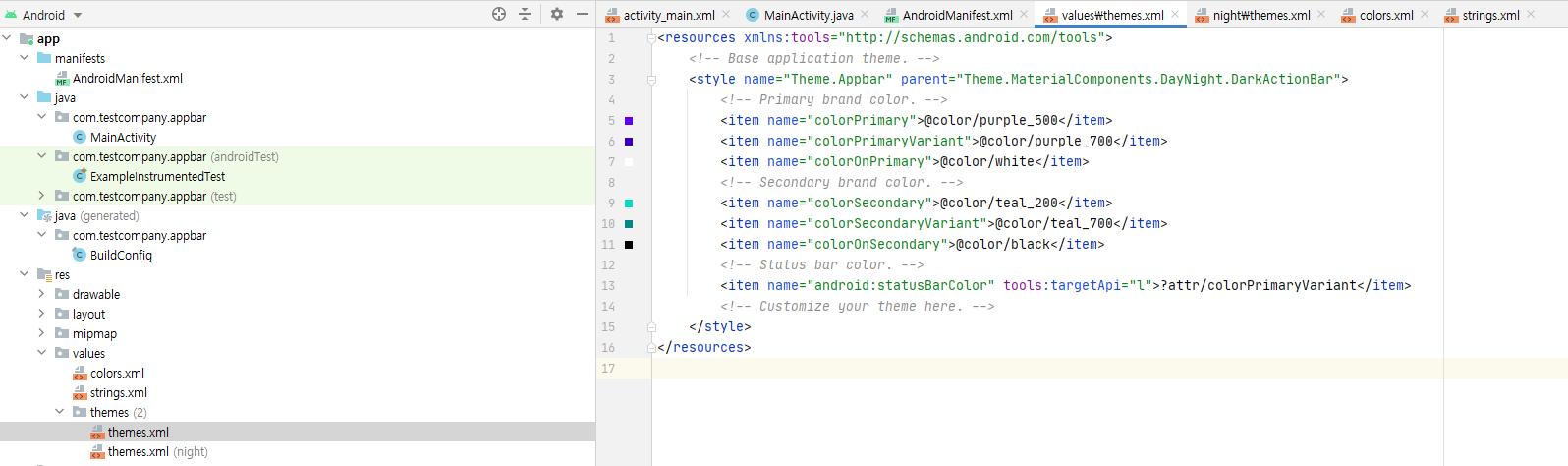 /res/values/themes.xml을 열어보면 다음과 같이 되어있습니다.