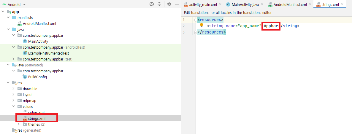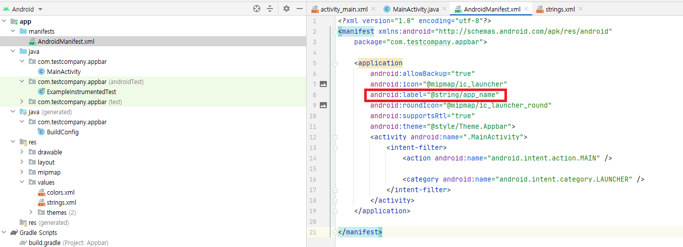 그냥 값을 변경해줘도 적용이 되지만 위에 이미지와 같이 "@string/app_name" 경로로 표기하여 경로에 있는 스트링을 변경해줘도 됩니다.