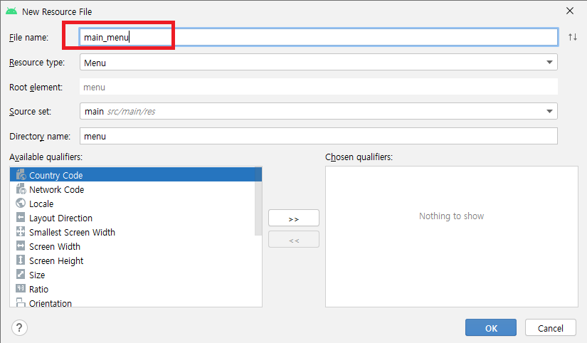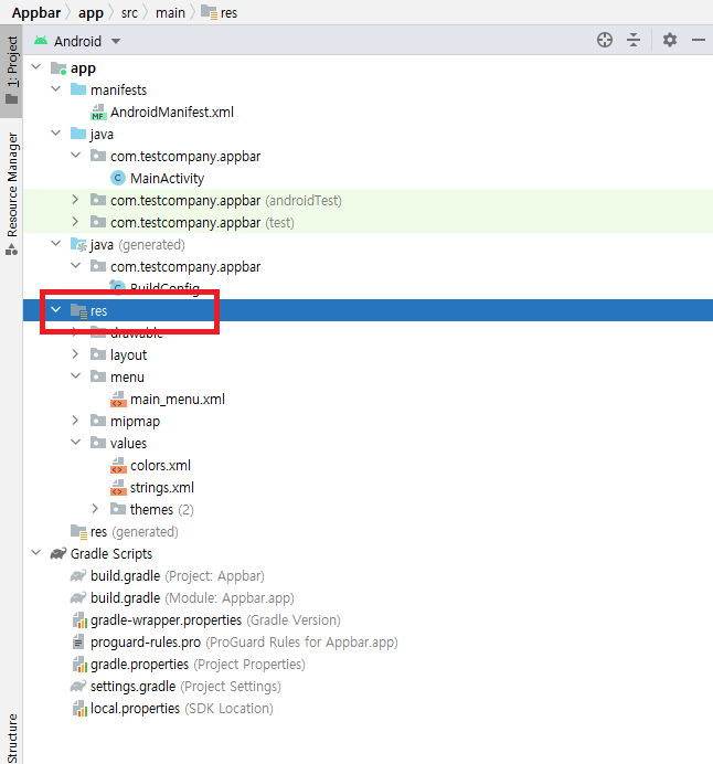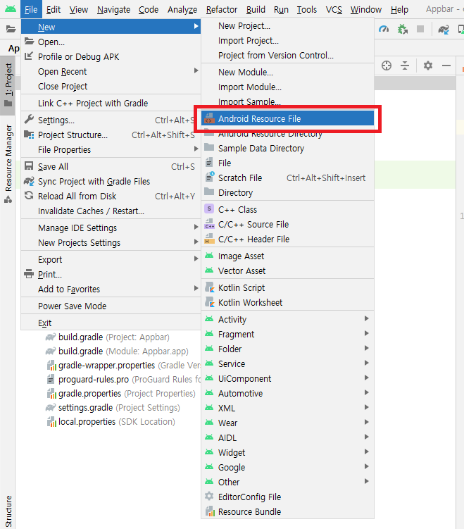 버튼을 추가하기 위해서는 일단 메뉴(Meunu) XML 파일을 먼저 추가해야 합니다.