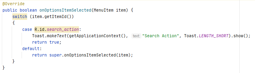 Toast.makeText(getApplicationContext(), "Search Action", Toast.LENGTH_SHORT).show();