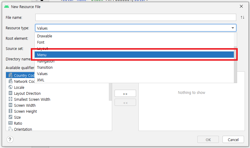 그리고 다음 나오는 창에서 "Resource type"항목의 리스트 박스에서 Menu를 선택합니다.