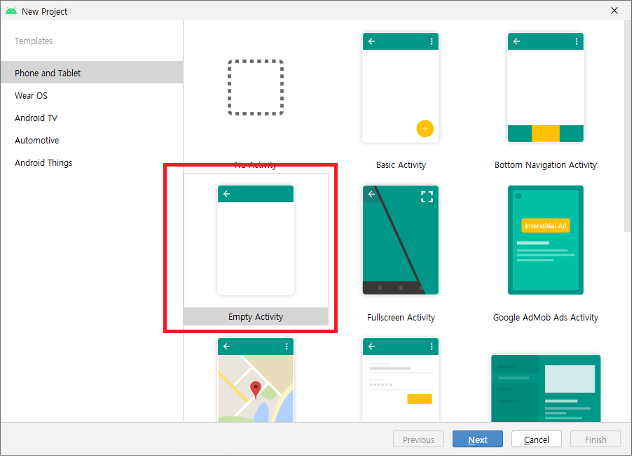 기본설정은 "Empty Activity"상태로 하겠습니다.