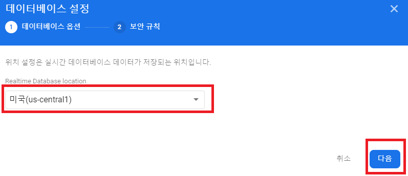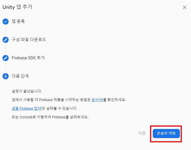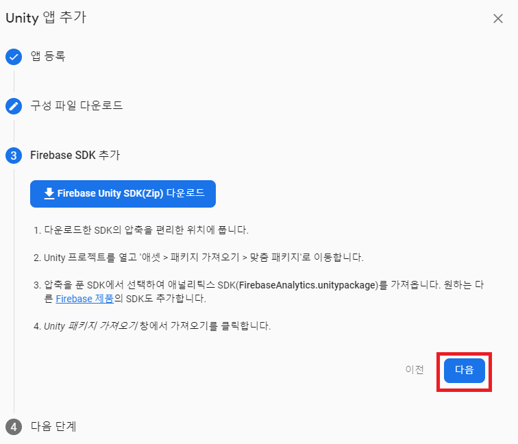 그 후 Firebase Colsole로 돌아와서 다음을 클릭합니다.