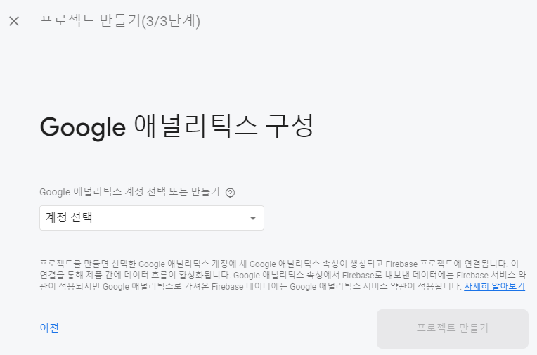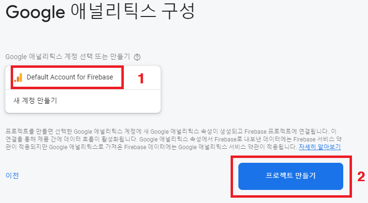 따로 계정이 있다면 설정해주고, 없다면 Default Account for Firebase를 선택한 후 프로젝트 만들기를 클릭합니다.