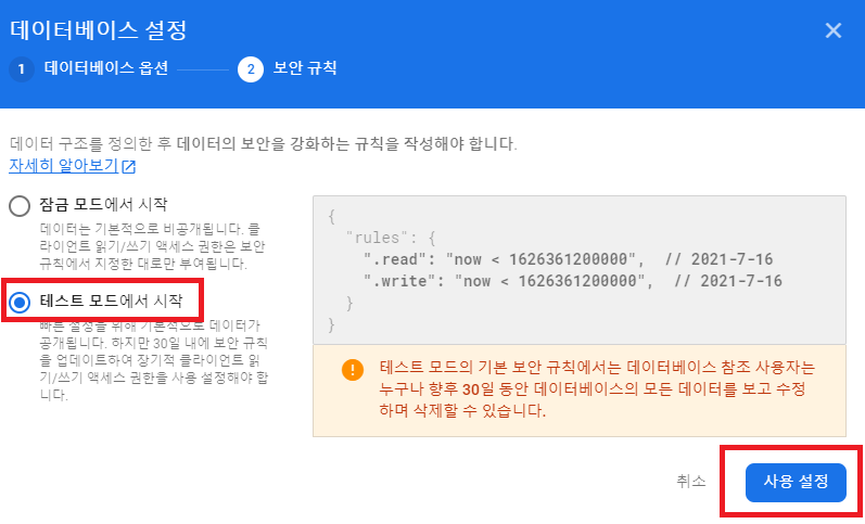2. Firebase에서 Database추가