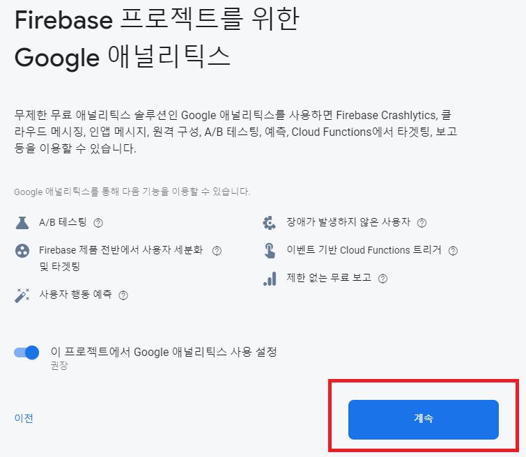 애널리틱스 사용여부를 확인한 후 계속 버튼을 클릭합니다.