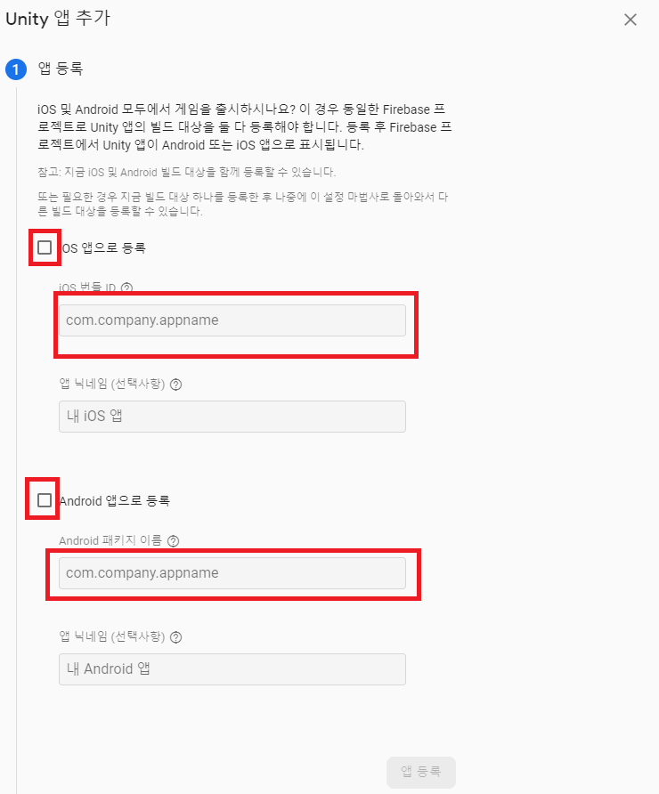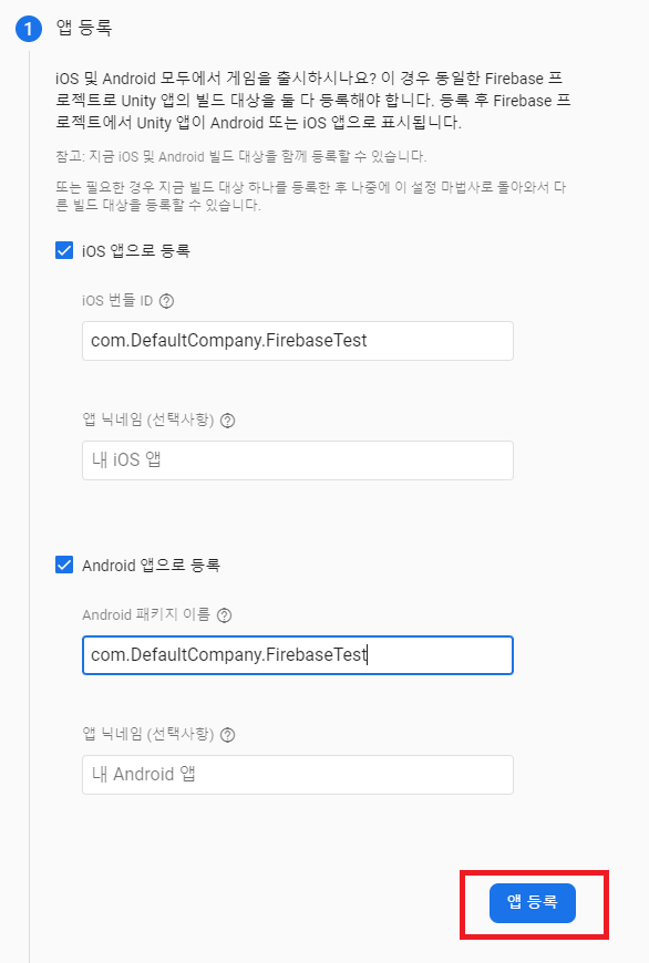 IOS번들ID와 Android 패키지이름을 넣으면 앱등록 버튼이 활성화됩니다.