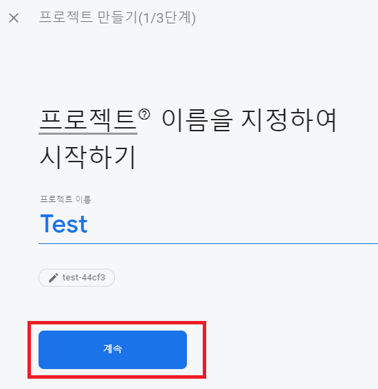 프로젝트 이름을 입력한 후 계속 버튼을 클릭해줍니다.