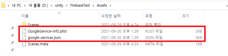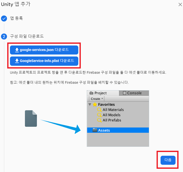 google-services.json, GoogleService-Info.plist 구성 파일 다운로드를 해서 Unity프로젝트의 Assets폴더에 넣어줘야합니다.