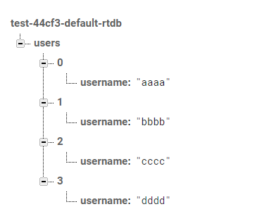WriteUserData함수를 통한 데이터를 저장하면, Database는 다음과 같이 저장됩니다.