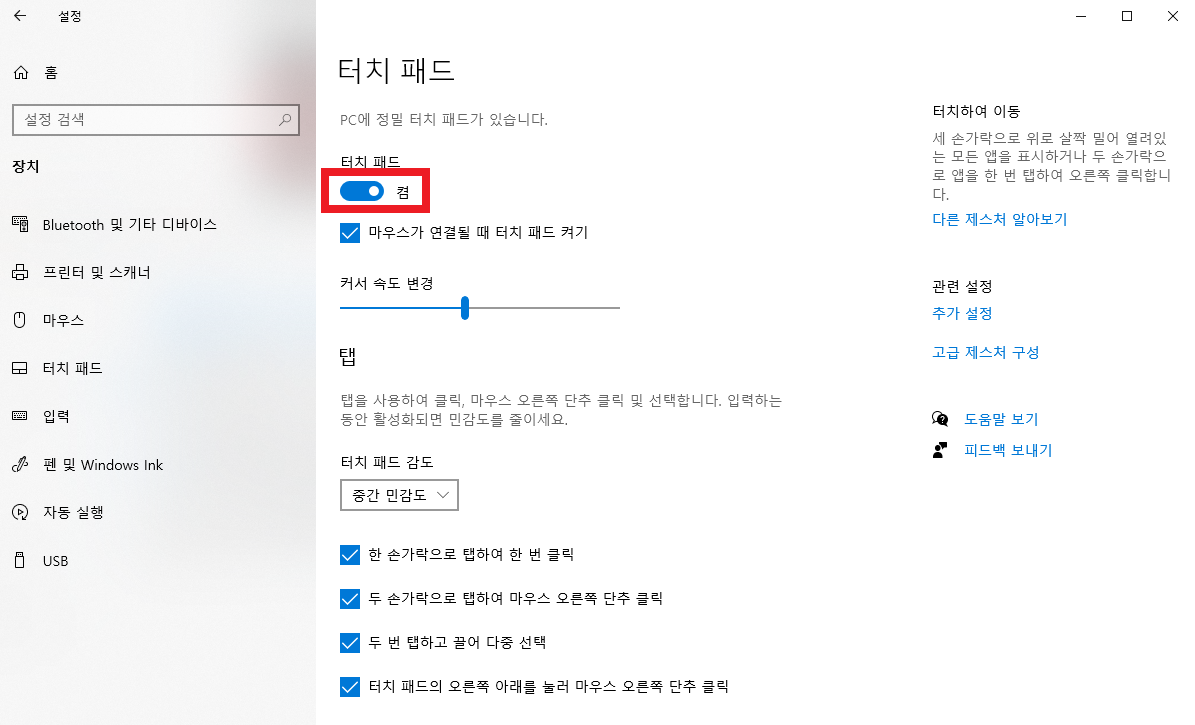 터치 패드 항목을 클릭하면 키고 끄기 가능합니다.