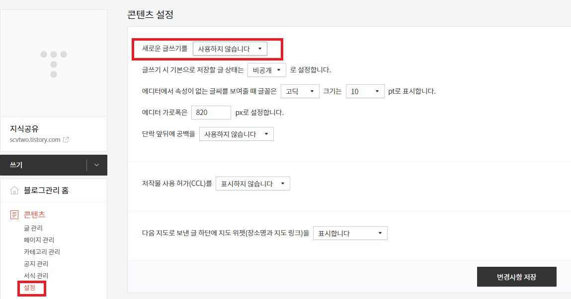 관리자 페이지에 설정 - 새로운 글쓰기를 사용하지 않습니다 로 설정합니다.