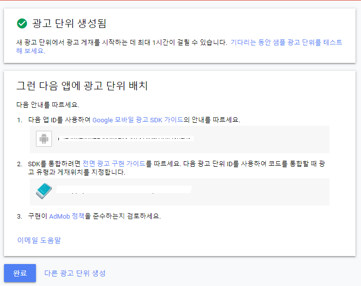 앱 ID와 단위 ID를 메모장에 넣고, 완료 버튼을 누릅니다.