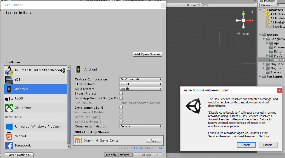 임포트 후 유니티 빌드 세팅을 Android로 설정합니다.