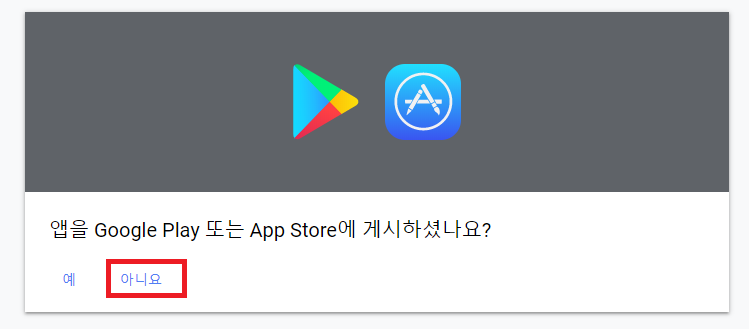 다음엔 앱을 게시했는지 확인하는 페이지가 뜨는데, 저는 아직 앱을 올리지 않았기 때문에 "아니요"를 눌렀습니다.