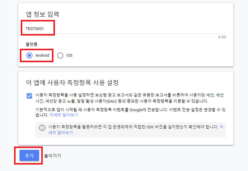 앱 ID와 광고 단위 아이디는 테스트용 아이디를 사용했습니다.