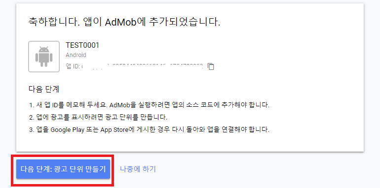앱 ID는 나중에 사용해야 하기 때문에 앱 ID를 메모장 같은데 복사해놓고 "다음 단계:광고 단위 만들기"를 누릅니다.