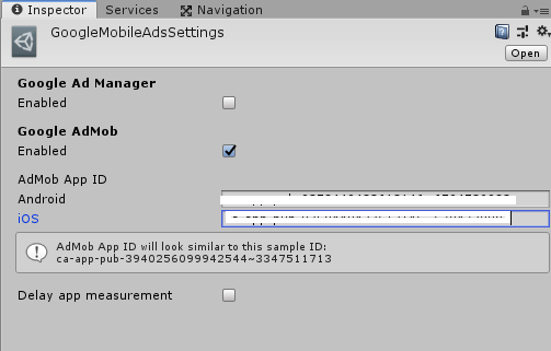 Inspector창을 보면 Google AdMob을 Enabled 체크하고 AppID를 넣습니다.