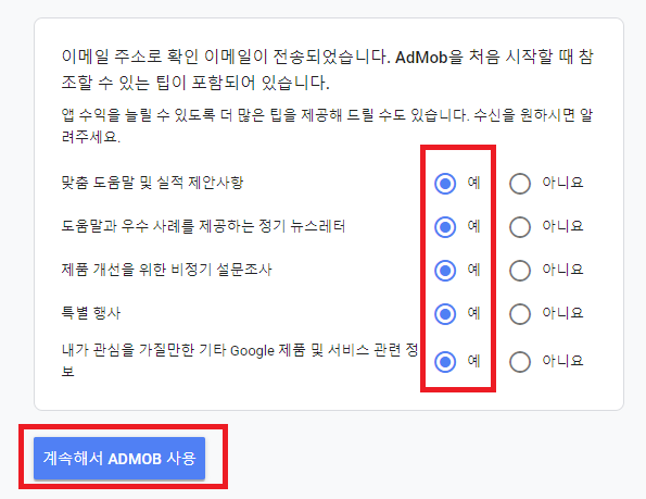 계정 생성이 완료되면 다음 페이지가 나오게 되는데, 저는 무슨 내용이 오는지 궁금해서 다 "예"로 체크했습니다.