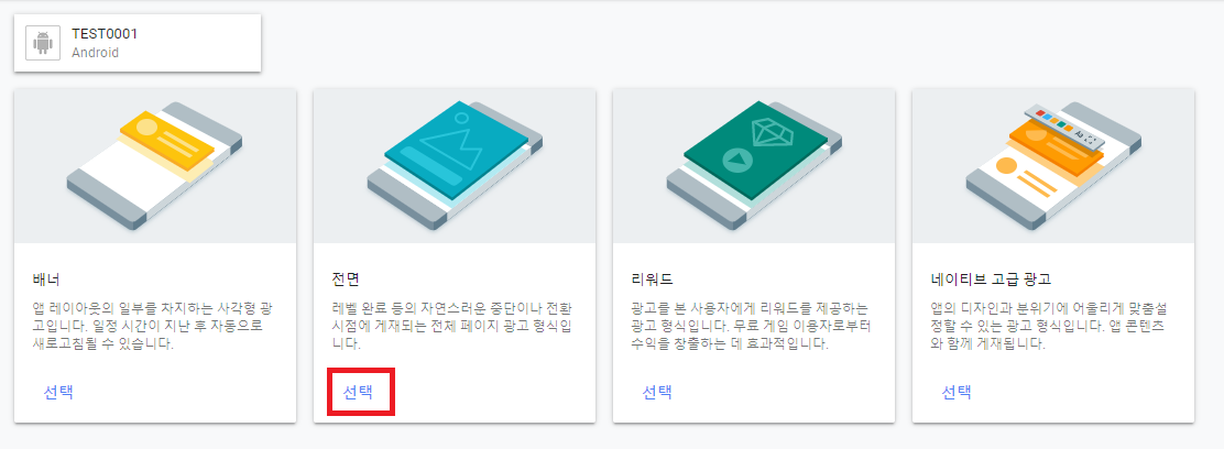 그람 광고 단위를 설정할 수 있는 페이지가 나오는데, 저는 전면 광고를 선택합니다.