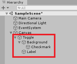 Hierarchy에서 Toogle이 가지고 있는 하위 오브젝트를 보면 Background(배경 이미지), Checkmark(체크 이미지), Lavel(텍스트)로 구성되어있는 것을 확인할 수 있습니다.