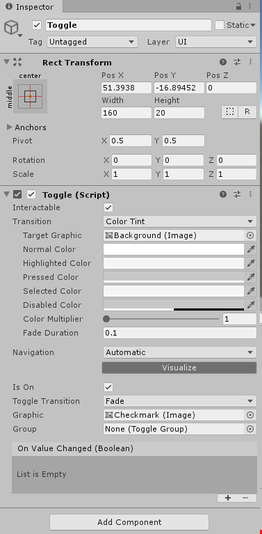 그리고 Toggle 오브젝트를 클릭해서 Inspector창을 확인해보면, 다음과 같이 구성되어있습니다.