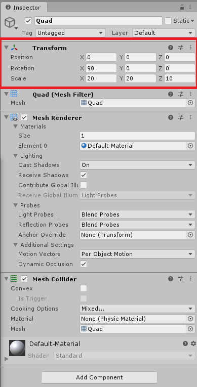 그리고, 생성 후 바닥 같은 모양을 만들기 위해, 크기와 로테이션을 변경하겠습니다.