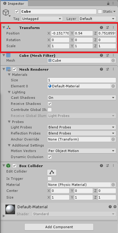 Cube Object를 바닥 오브젝트와 적당한 거리로 이동시킵니다.