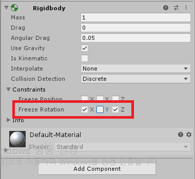 constaints(제약) 설정을 보시면 Freeze Rotation에 x, z를 체크합니다.