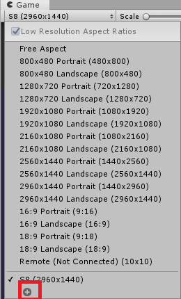 유니티 에디터 상에서 해상 해상도를 설정하는 방법은 게임 탭에서 해당 해상도를 추가하는 방법입니다.