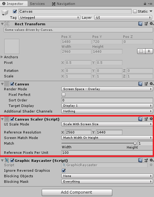 캔버스 스케일러(Canvas Scaler) 컴포넌트는 캔버스 내 UI 요소의 전체적인 스케일과 픽셀 밀도를 제어하는 데 사용됩니다. 스케일은 글꼴 크기와 이미지 경계 등 캔버스 아래의 모든 요소에 영향을 미칩니다.