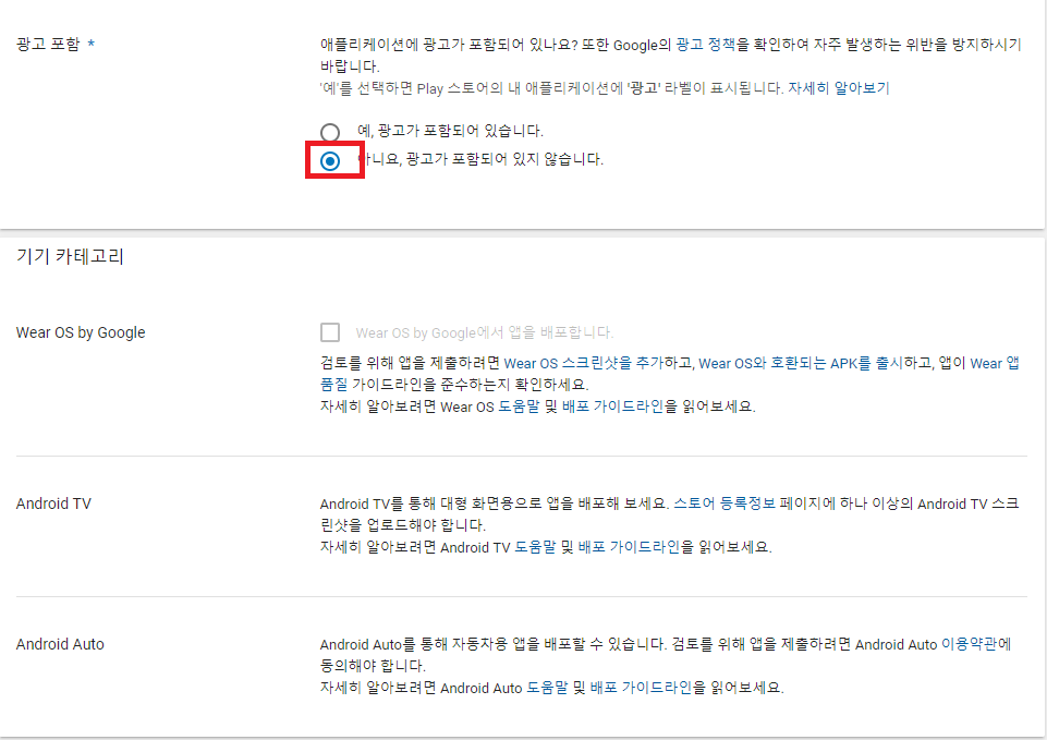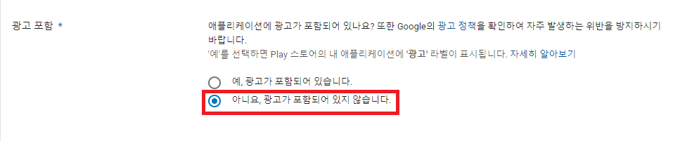 광고가 있다면 "예, 광고가 포함되어 있습니다"를 체크합니다.