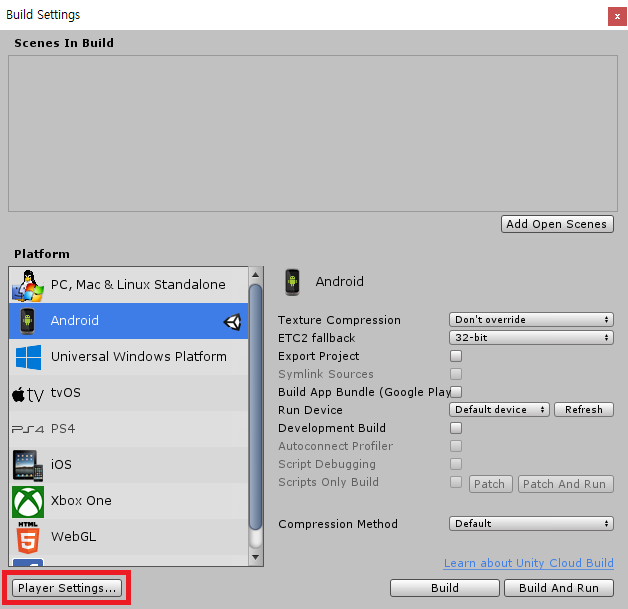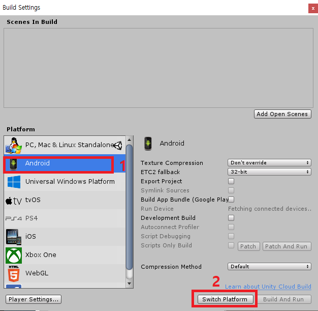Switch Platform을 한 후 Player Settings...버튼을 누릅니다.