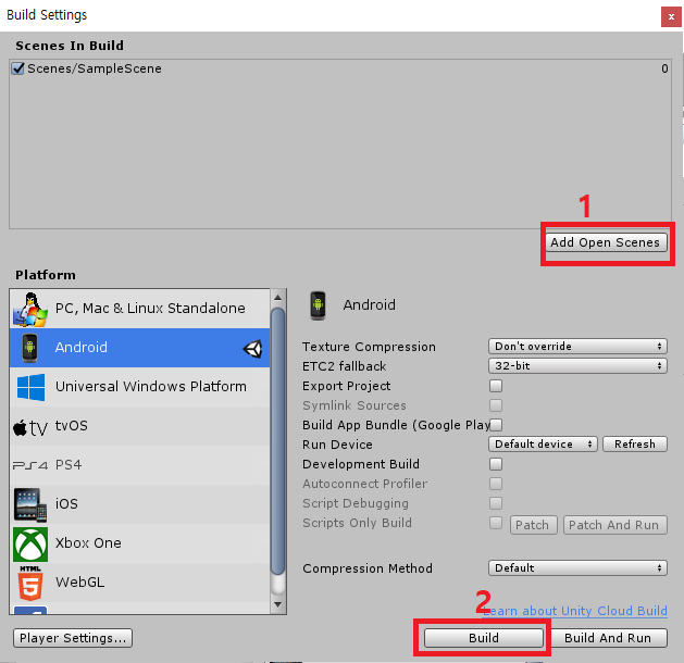 만약 씬이 추가가 안되어있다면 "Add Opn Scenes"를 누릅니다.